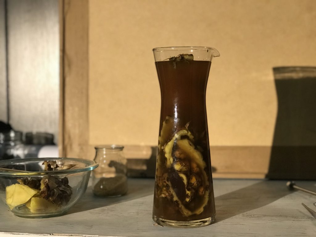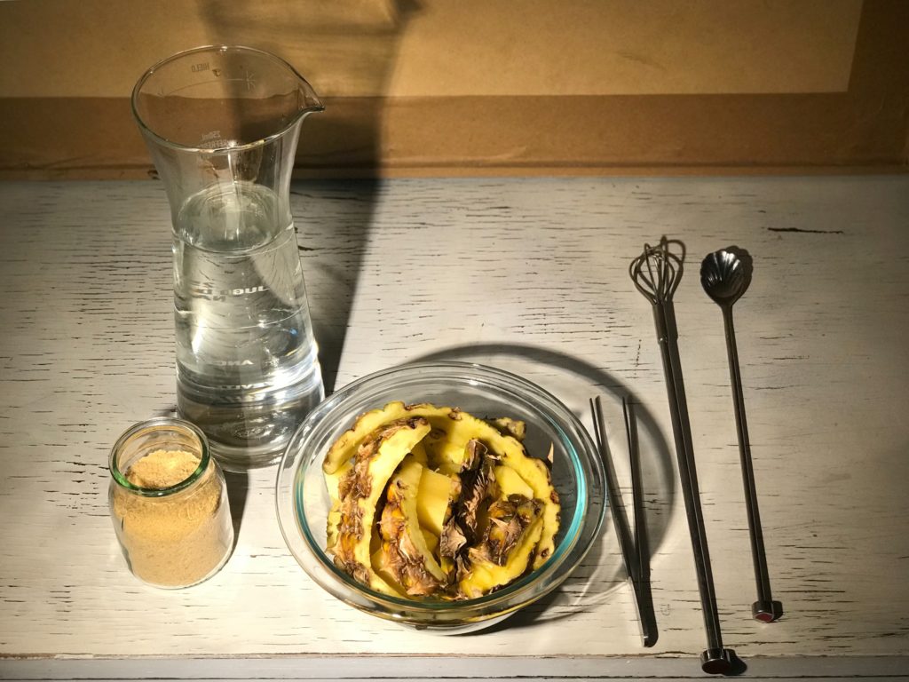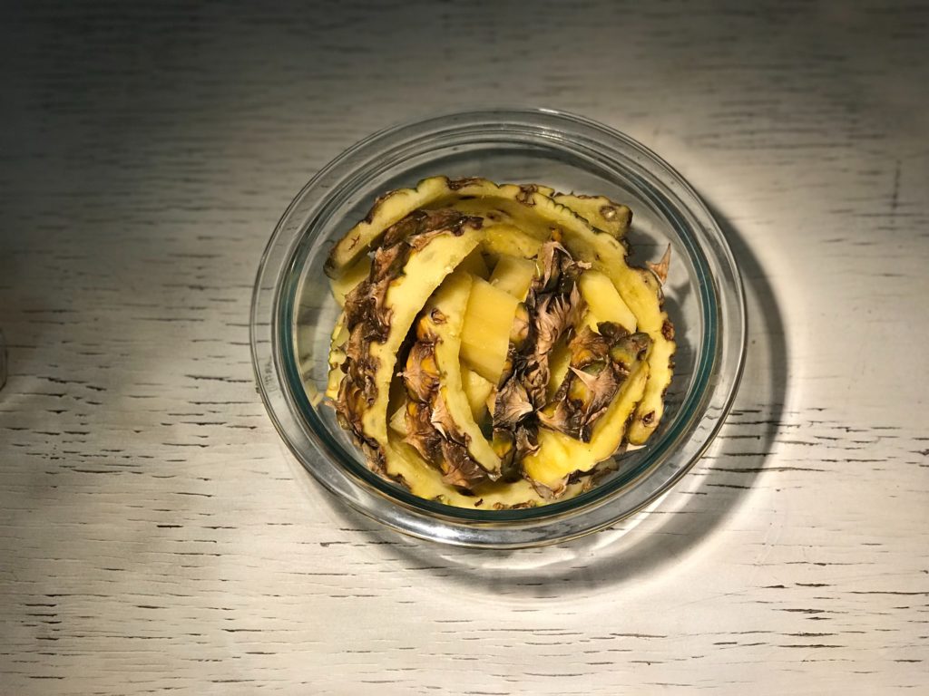 - Poner las cáscaras y el centro de la piña dentro del recipiente con el agua endulzada