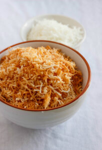 Una vez que está tostado podés utilizarlo en cualquier preparación que requiera coco rallado. ¿Leche de coco con coco tostado? claro que sí, ¿granola con coco tostado? fan.